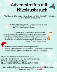 Mit Besuch vom Nikolaus höchstpersönlich. Dieses Jahr kennt ihr ihn noch nicht – lasst euch überraschen! Für die Kinder gibt es Säckchen mit kleinen Leckereien. Damit sich der Nikolaus vorbereiten kann, sagt bitte Bescheid, wie viele Kinder ihr mitbringt. Einfach eine kurze Nachricht an: Henni 015206405964 oder Marius 01754943179